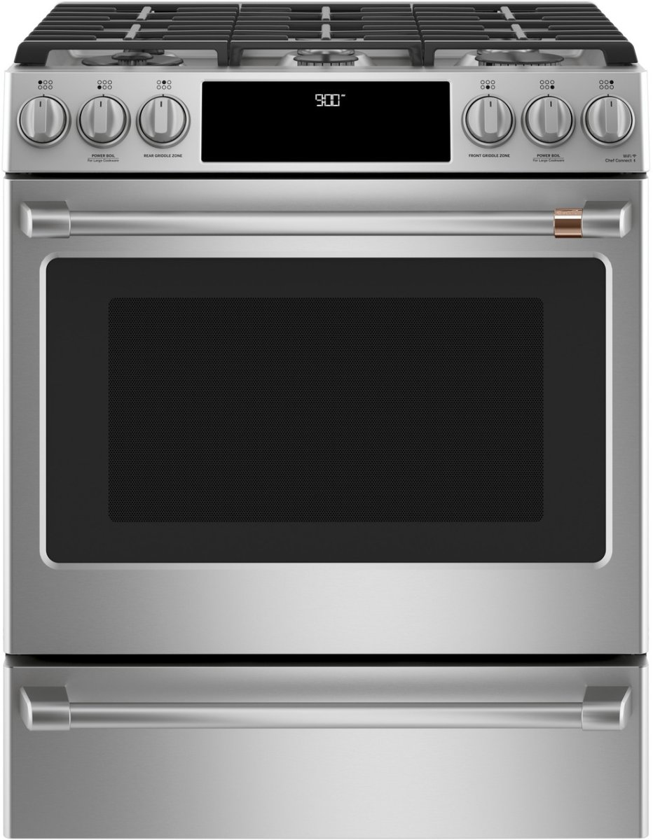 Explore your love of entertaining. This Dual Fuel slide-in range unites the power of a gas cooktop with the precision of an electric oven. The industry’s first edge-to-edge cooktop with six versatile burners also includes an integrated griddle to easily handle large meals and family favorites.Read More